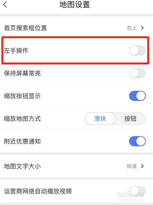 第四步,在地图设置界面中,找到【左手操作】点击右侧的按钮