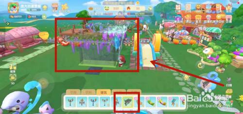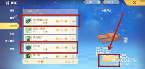 在游戏商城中,找到简约糊口组百口具中的圆石板跟简约紫藤花架,进行采办。