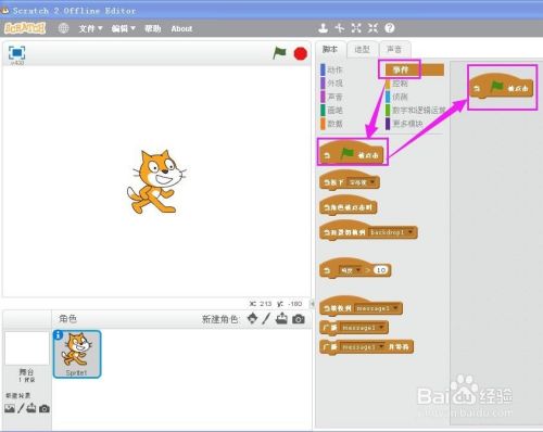 在事务中,将当绿旗被点击时拖到右边的剧本编纂区;