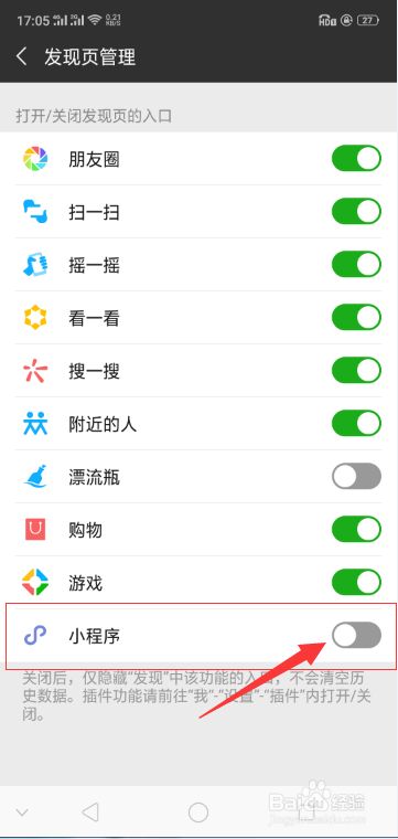 在进入发现页办理设置本家儿界面后,将小程序按钮点开