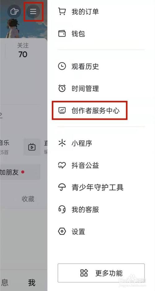1、在小我本家儿页点击三横图标后,点击创作者办事中间。