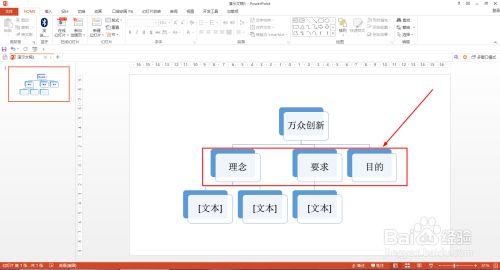 在三个第二分支文本框中从左到右别离输入:理念、要求、目标。