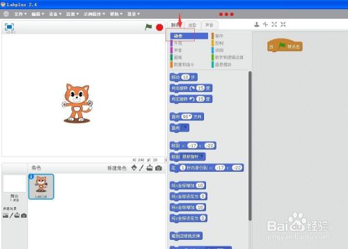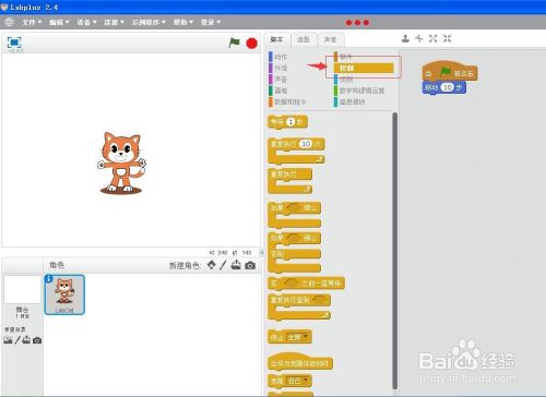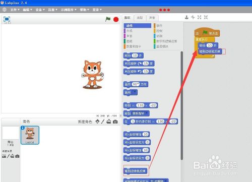 将动作模块的“碰着边缘就反弹”号令拉到右边的剧本编纂区,就可以让小猫不断地活动了。