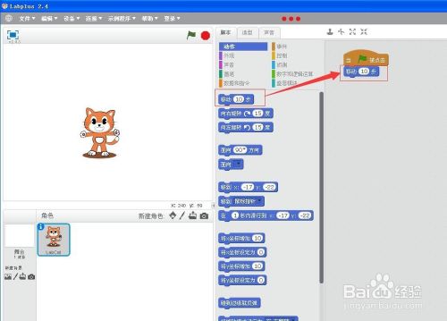 点一下绿旗,程序起头运行,并且移动到屏幕的右侧才停下来;