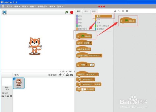 点一下“事务”模块,将当绿旗被点击时拉到右边的剧本编纂区;