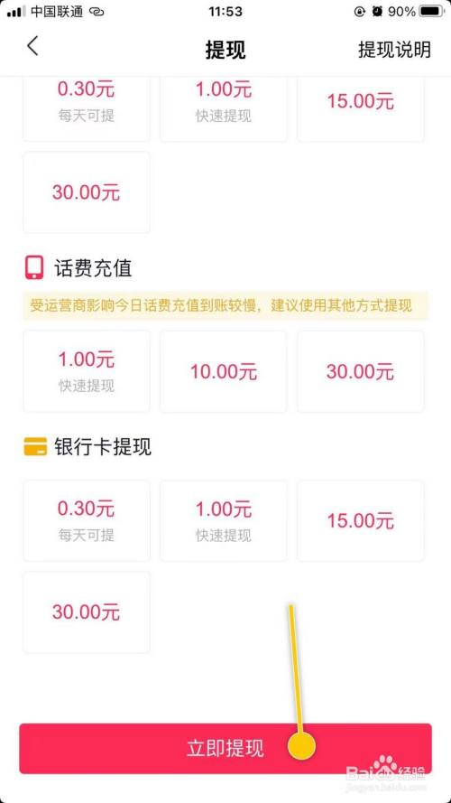 END在“提现”界面中,选中提现金额,点击下方的“当即提现”按钮。