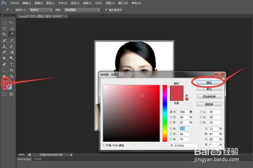接下来我们将前景色选择为红色,也就是即将填充的布景色。鼠标点击【设置前景色】图标,经由过程鼠标点击响应颜色区域确定前景色颜色,最后点击确定,这样就设置好了前景色。