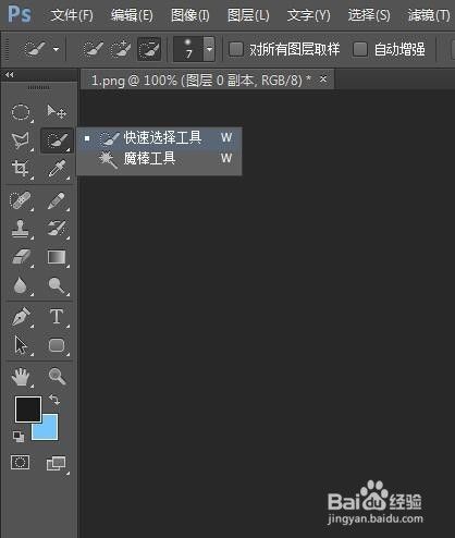 接下来,将布景选中为选区,即抠出人像。在【快速选择】东西里面选择【快速选择东西】,将布景板选中。