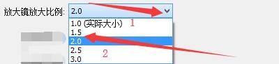 在“放大镜”窗口中,点击“放大镜放大比例2.0”,在弹出栏目框中,点击“1.5”