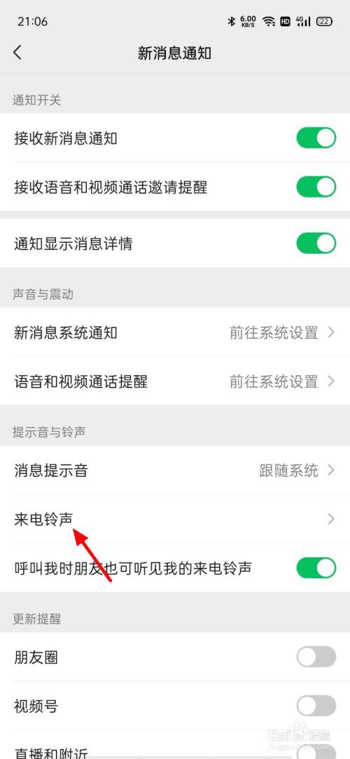 在通知页面,单击来电铃声。