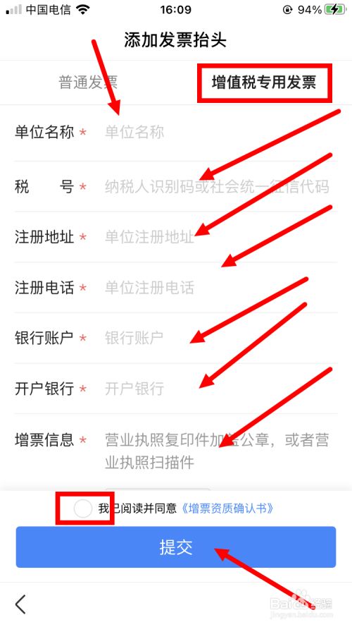若是是增值税专用发票,需要填写【单元名称】、【税号】、【注册时候】、【注册德律风】、【银行账户】、【开户银行】,上传营业执照复印件加盖公章或营业执照扫描件,再点击勾选【确认书】,最后点击【提交】。