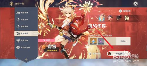 工具/原料红米k30 变焦版MIUI12.2.3原神1.5.1方式/步骤1我们进入原神游戏中,点击箭头指的位置,进入活动栏。2在这里我们点击且试身手,接着点击起头试用。3然后我们点击起头挑战,我们要将这些怪物全数击败。4最后我们挑战当作功,返回到活动栏,点击领取,这样我们就可以获得鸣草了。END