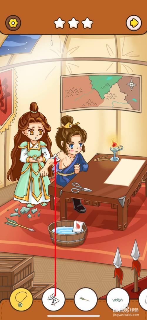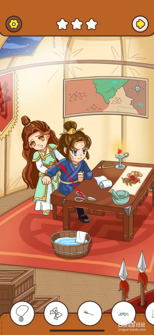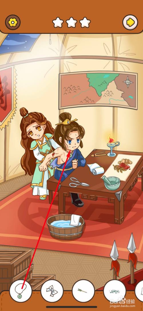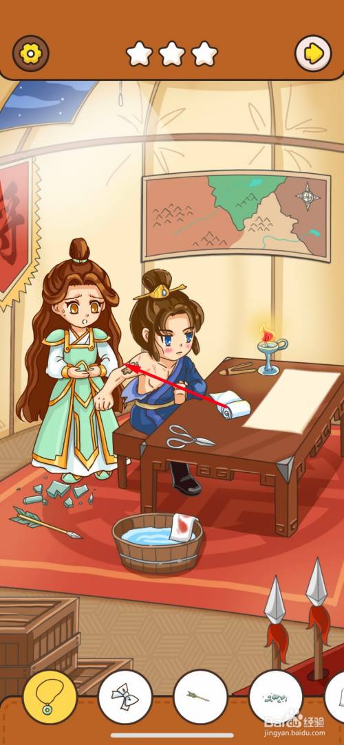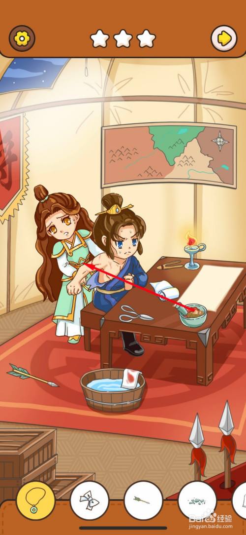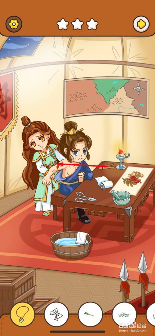 拖动桌上的钳子到箭的位置,将箭拔出。
