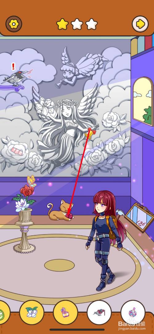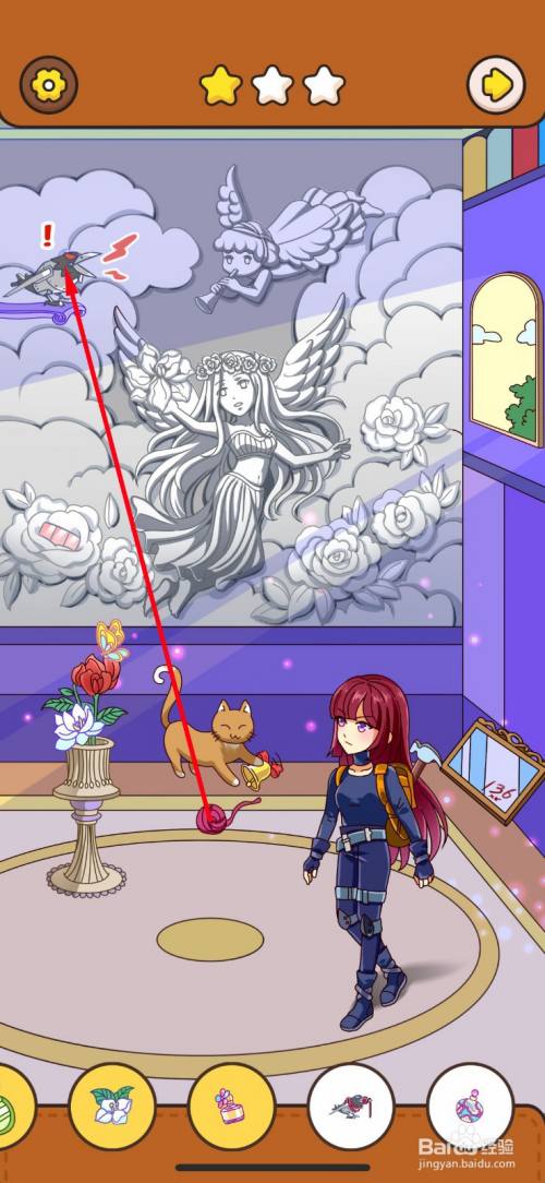 把小猫手中失落下来的毛线球拖动到机关鸟上。