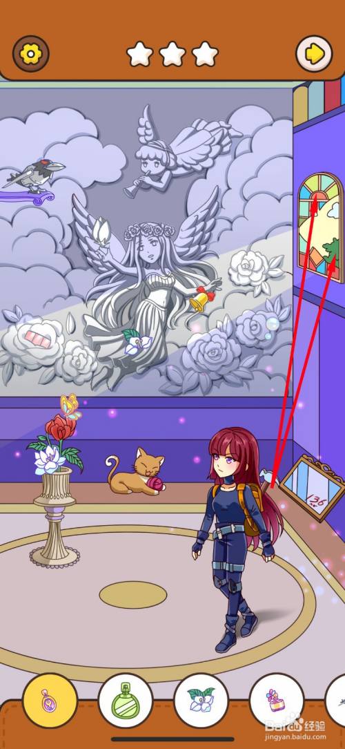 下面的窗户敲碎后光线照进来,可以看到墙上花儿的雕饰露出了要找的第二件物品。