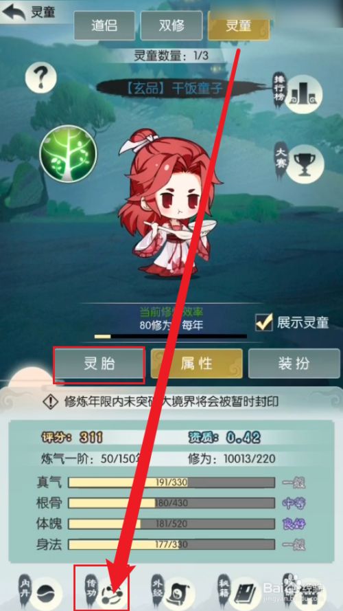 工具/原料iPhone12IOS14.6无极仙途1.0方式/步骤1打开游戏,如图所示点击前去【洞府】。2如图所示点击查看【道侣】3如图所示点击进入【灵童界面】4如图所示选择【干饭孺子】进行传功可孕育【灵胎】5如图所示传功孕育灵胎后即可获得嫦小娥END注重事项孕育【灵胎】获得嫦小娥