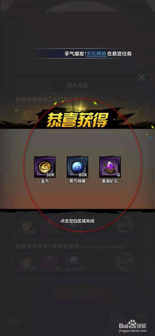 获得蓄魔矿石等材料奖励,点击空白区域封闭即可。