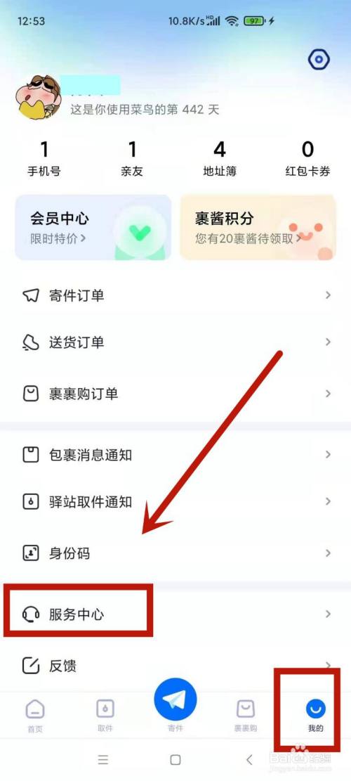 在菜鸟我的页面,点击进入办事中间选项。