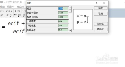 打开“间距”对话框,在该对话框中可以设置公式中各个元素的间距,如图所示。