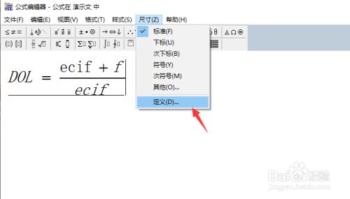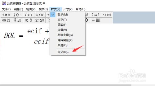弹出“公式编纂器”窗口,单击“样式”菜单栏下拉列表中的“界说”选项,如图所示。