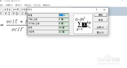 打开“尺寸”对话框,在该对话框中可以设置公式中各个元素的大小,如图所示。