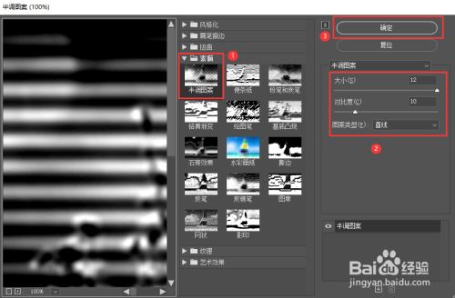 接下来,我们在【素描】的下面选择【半调图案】,然后把大小设置为【12】,对比度为【10】,图案类型为【直线】,点击【确定】。