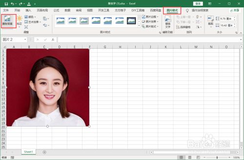 点击选中证件照,在“图片格局”选项卡下点击“删除布景”。