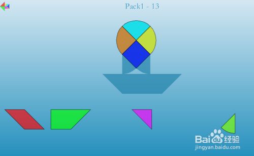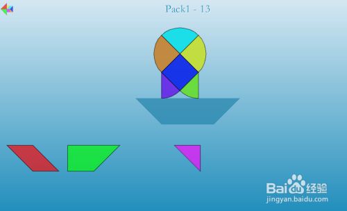 最后在粉色三角形的右侧,放上绿色梯形挨着,如图,这样就通关了。