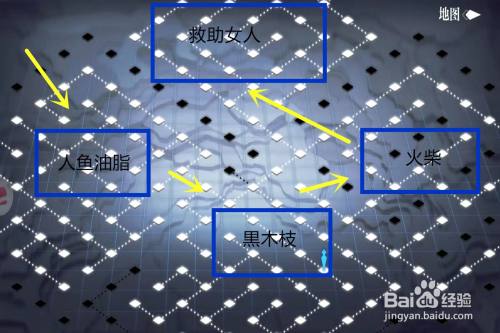 进入地图二,玩家在第一个位置打人鱼王拿人鱼油脂和肉,去第二个位置打岩石壳怪拿黒木枝,去第三个位置打裂口熊拿火柴,去第四个位置救助女人追踪选择埋没奖励拿钥匙,拿完钥匙在第四个位置打boss即可通关。
