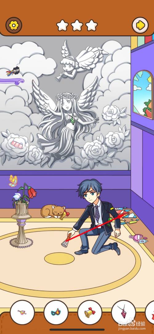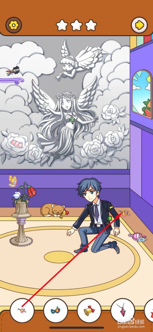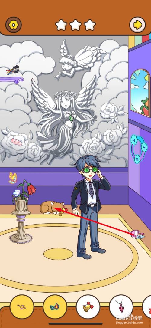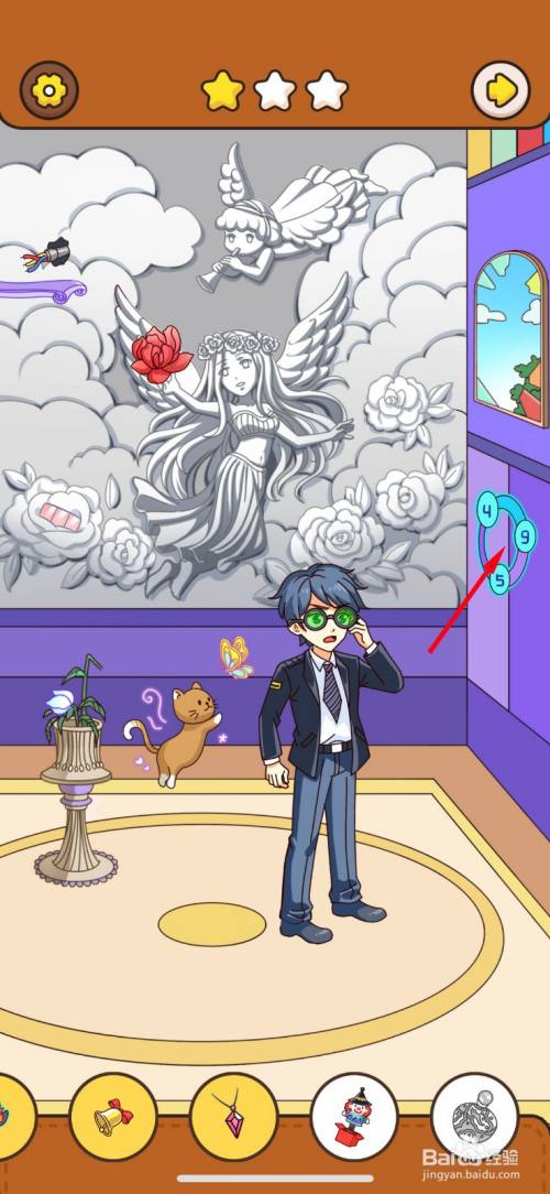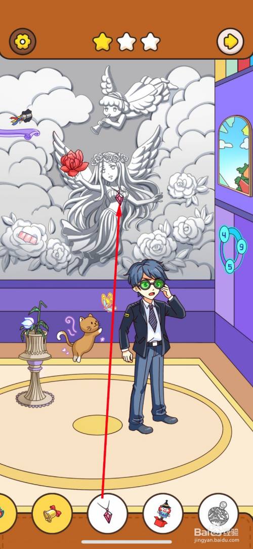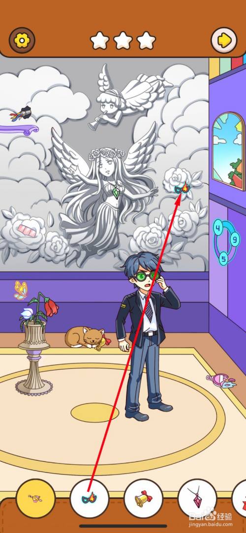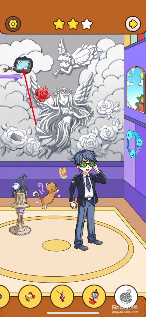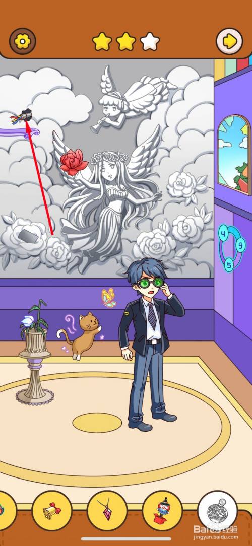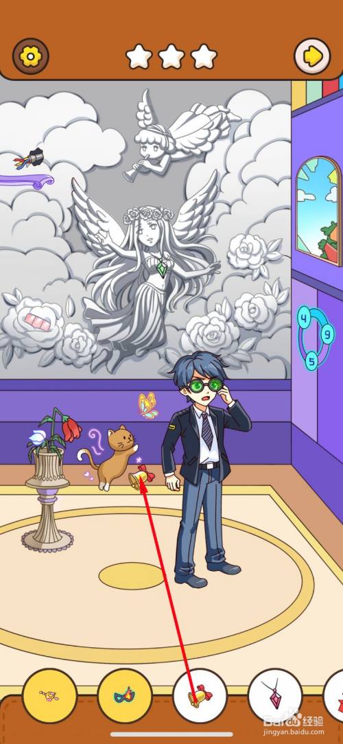 猫咪起身去抓蝴蝶的时辰,身下面的铃铛就露出来了,这是我们要找的第三件物品。