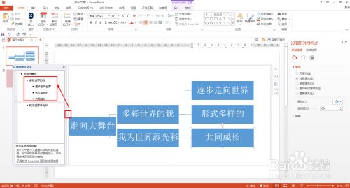 选择题目文本框——SMARTART东西——格局——扭转——标的目的右扭转90°,移动文本框到合适位置并输入题目名称。