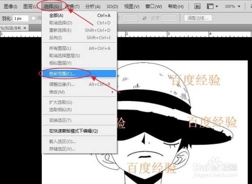 打开PS软件,点击“选择”,点击“色彩规模”。