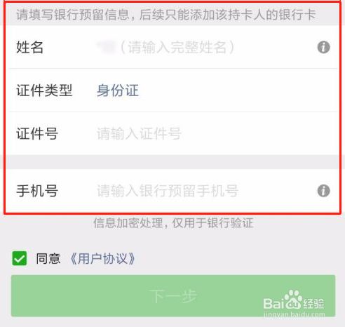填写本人的银行卡的卡号、真实姓名、身份证号和手机号,点击【下一步】。