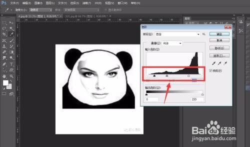 继续点击菜单栏的【图像】——【调整】——【色阶】,将色阶页面滑块由两侧标的目的中心滑动,结果如下图。