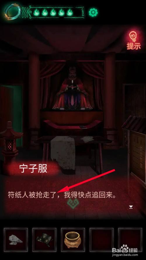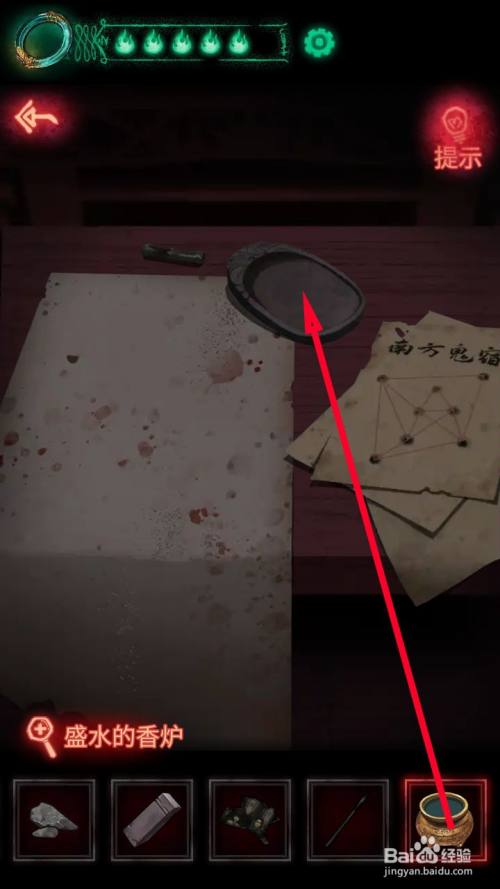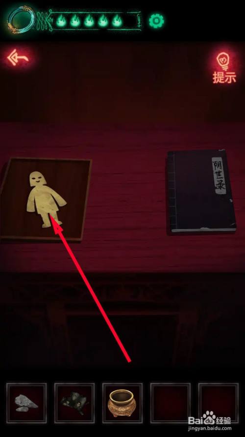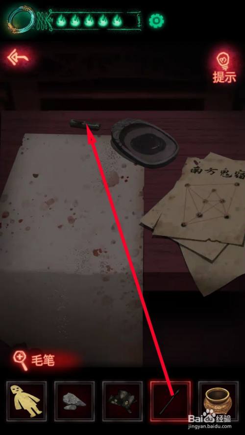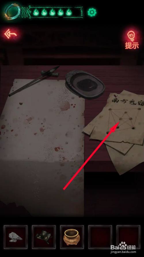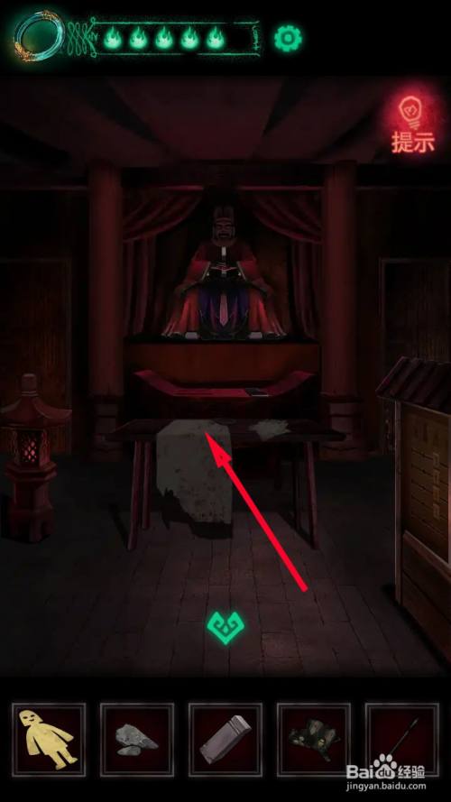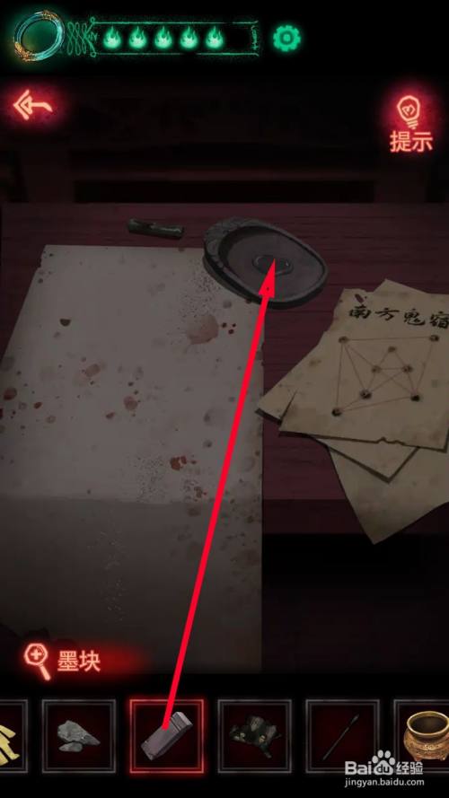 当收集到水、墨块、毛笔后,来到城隍庙内部点击桌子接近查看。