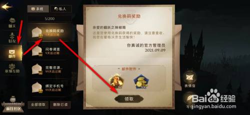 点选“邮件”-“兑换码奖励”,点击“领取”。