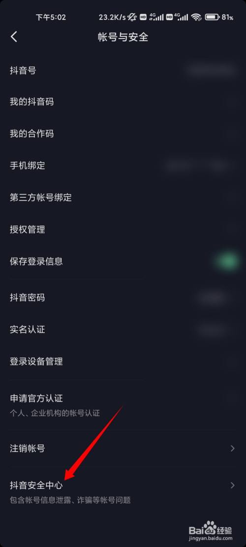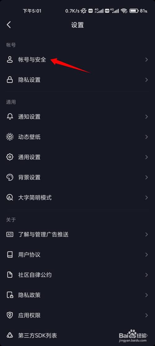 点击帐号与平安的选项。