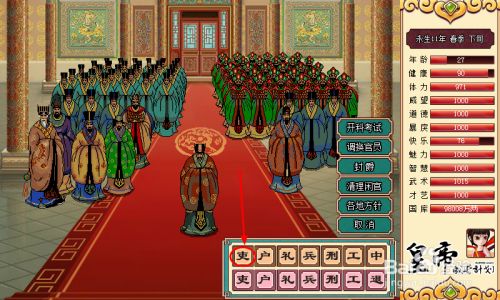 存眷皇帝的健康值,不要让它低于50点,金龙殿可恢复健康值,青炉房可炼药,吃药可提高上限。