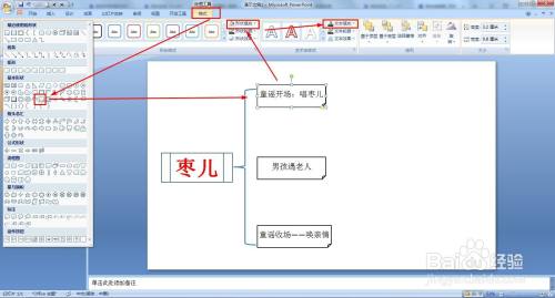 别离选择左大括号和折角形——起头——复制,粘贴,调整大小并移动到响应位置,在右侧继续建造第三分支内容。