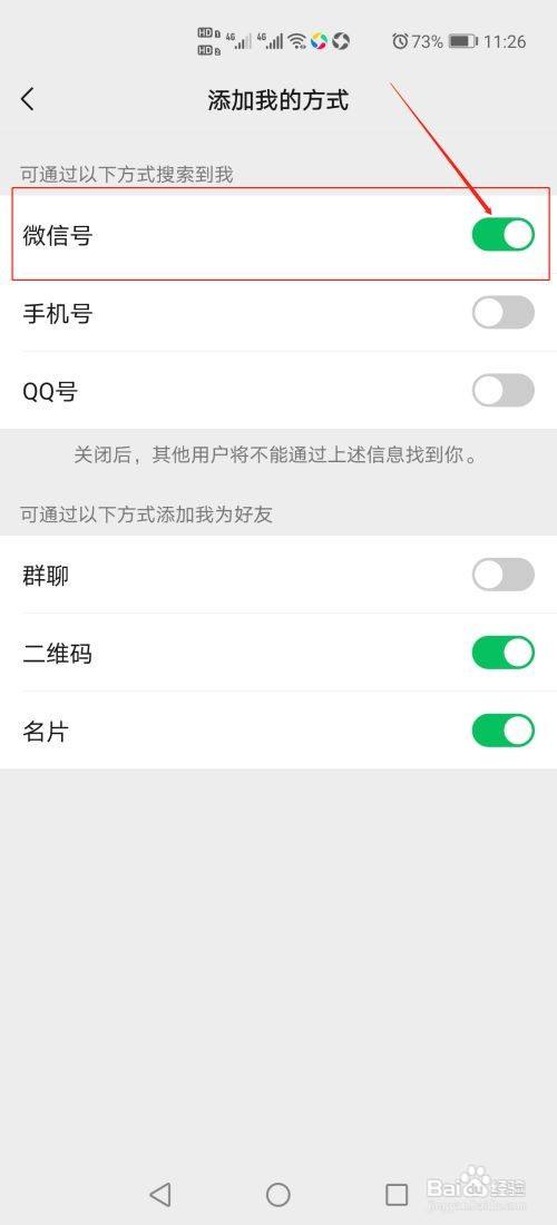 第六步、点击微旌旗灯号右边的菜单。打开当作绿色的,其他的把它封闭,灰色是封闭的,这样我们就设置了只能经由过程微旌旗灯号添加我们为老友了