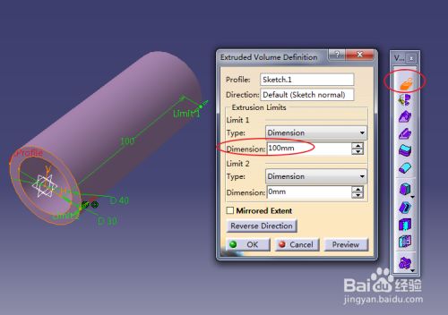 点击“Volume Extrude”东西,在Dimension中输入长度为100毫米,点击“OK”即可绘制出圆管。