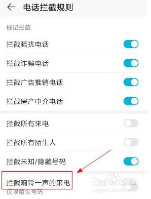6、阻挡响铃一声的来电选项,点击右侧的开关按钮。
