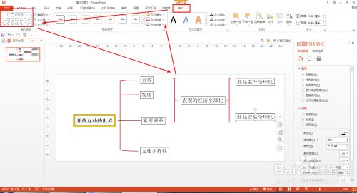 画图东西——格局——在插入外形平分别选择左中括号及直线画出思维布局线条——外形轮廓都设置为红色。