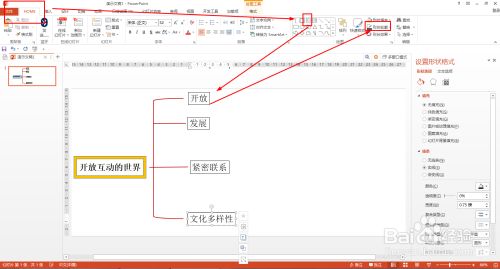 HOME——文本框——输入在二级分支内容——外形轮廓设置黑色。