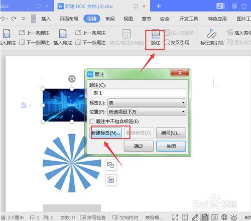 在【引用】项下,找到【题注】按钮。在弹出的题注对话框中,单击【新建标签】按钮。并在弹出的新建标签面板,按照需要设置新的标签,单击【确认】按钮。