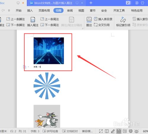 打开文档,选中一张图片,在菜单栏处找到【引用】选项。