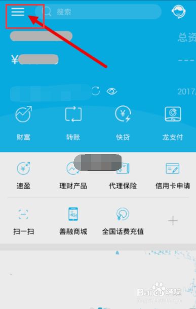 农村合作信用社手机银行客户端登录当作功后,点击首页窗口左上角的“三”图标(更多选项),打开更多选项列表。
