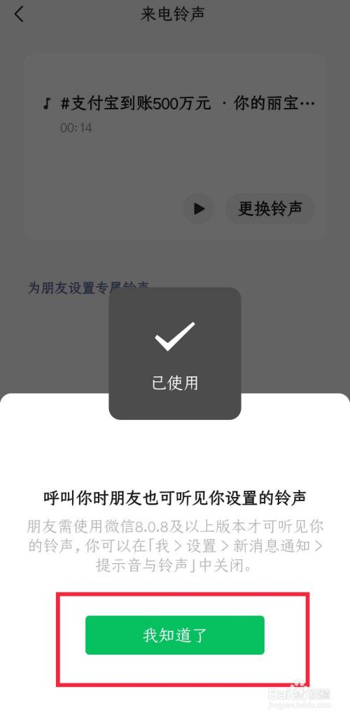 打开如下图界面,提醒个性铃声已经设置当作功了,点击我知道了按钮退出。