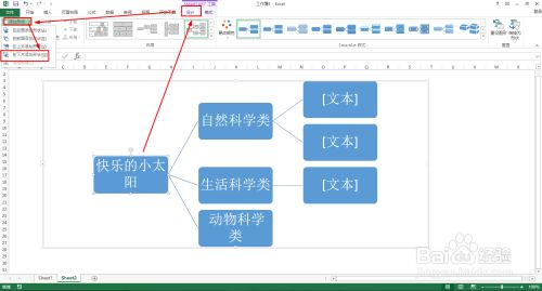 输入题目:欢愉的小太阳——SMARTART东西中的设计——添加外形——鄙人方添加外形,输入三个二级题目:欢愉的小太阳、天然科学类 、糊口科学类、动物科学类。