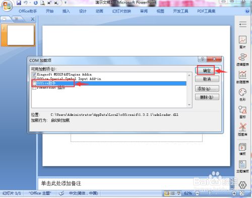 在COM加载项中找到office助手,可以看到当前状况是选中;